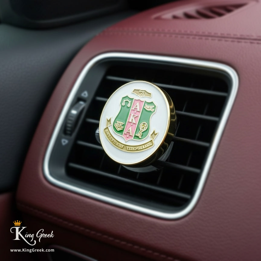 Celebrate your sisterhood wherever you go with this elegant Alpha Kappa Alpha car freshener, designed to add both fragrance and flair to your ride. Featuring the iconic AKA crest in signature pink and green, this piece combines pride, style, and freshness in one sleek design.