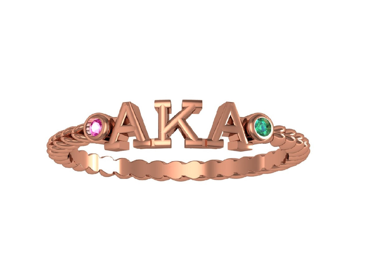Showcase your Alpha Kappa Alpha pride with this elegant horizontal banded ring — a must-have accessory for every sister. Celebrate the rich heritage of Alpha Kappa Alpha with this expertly crafted twisted silver ring, plated in rose gold. Made from high-quality sterling silver, the design elegantly showcases the iconic AKA letters, symbolizing over a century of sisterhood and service.
