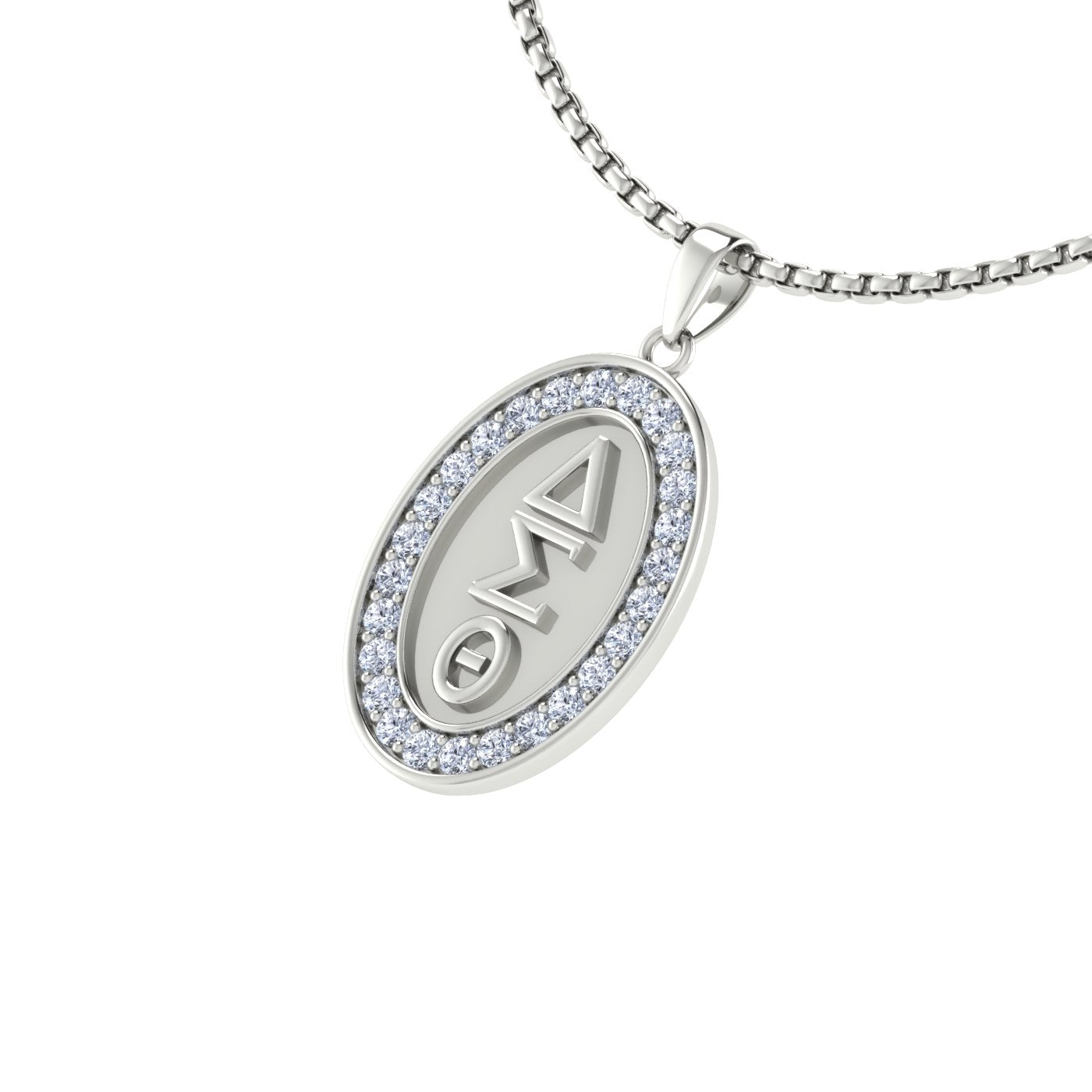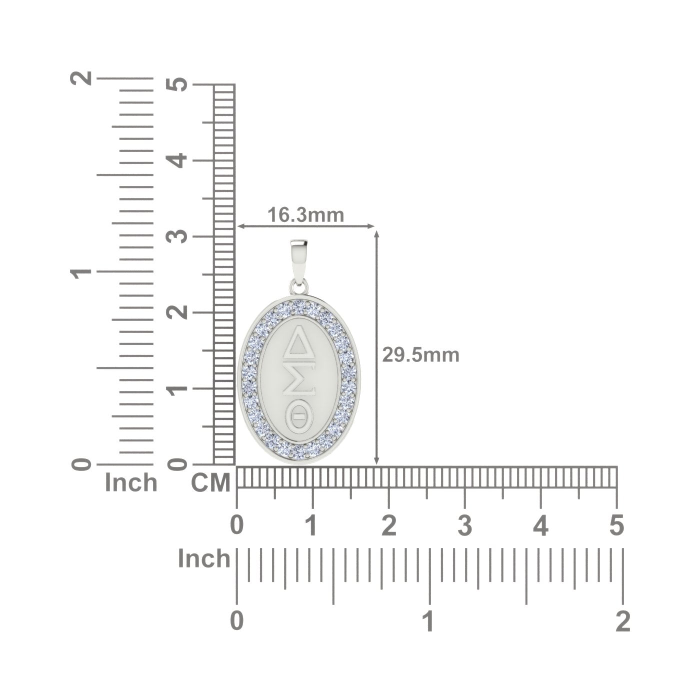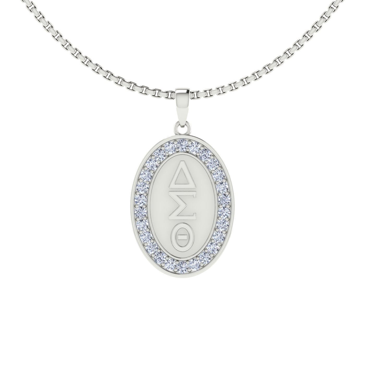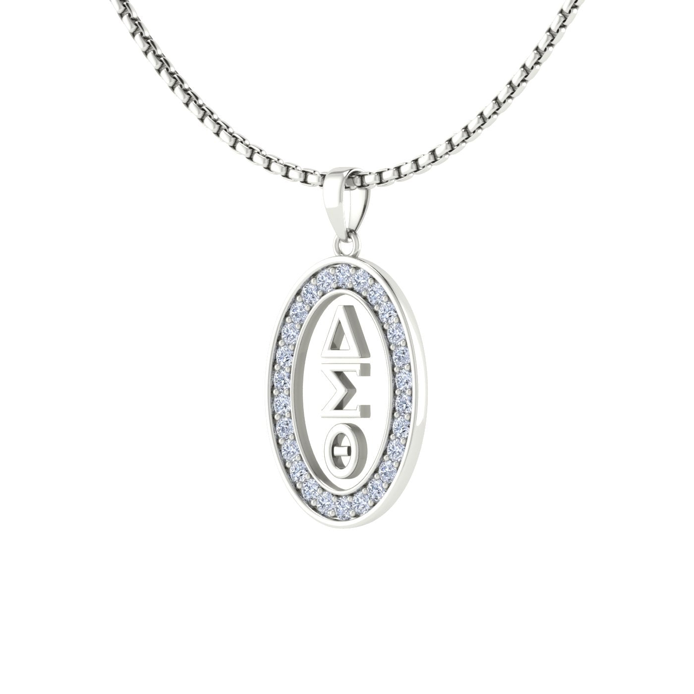 Celebrate sisterhood with the Delta Sigma Theta jewelry sterling silver oval pendant, featuring iconic Greek letters framed by sparkling pave cubic zirconia. Designed exclusively by King Greek, this elegant DST pendant embodies timeless style—perfect for everyday wear or meaningful gifting.