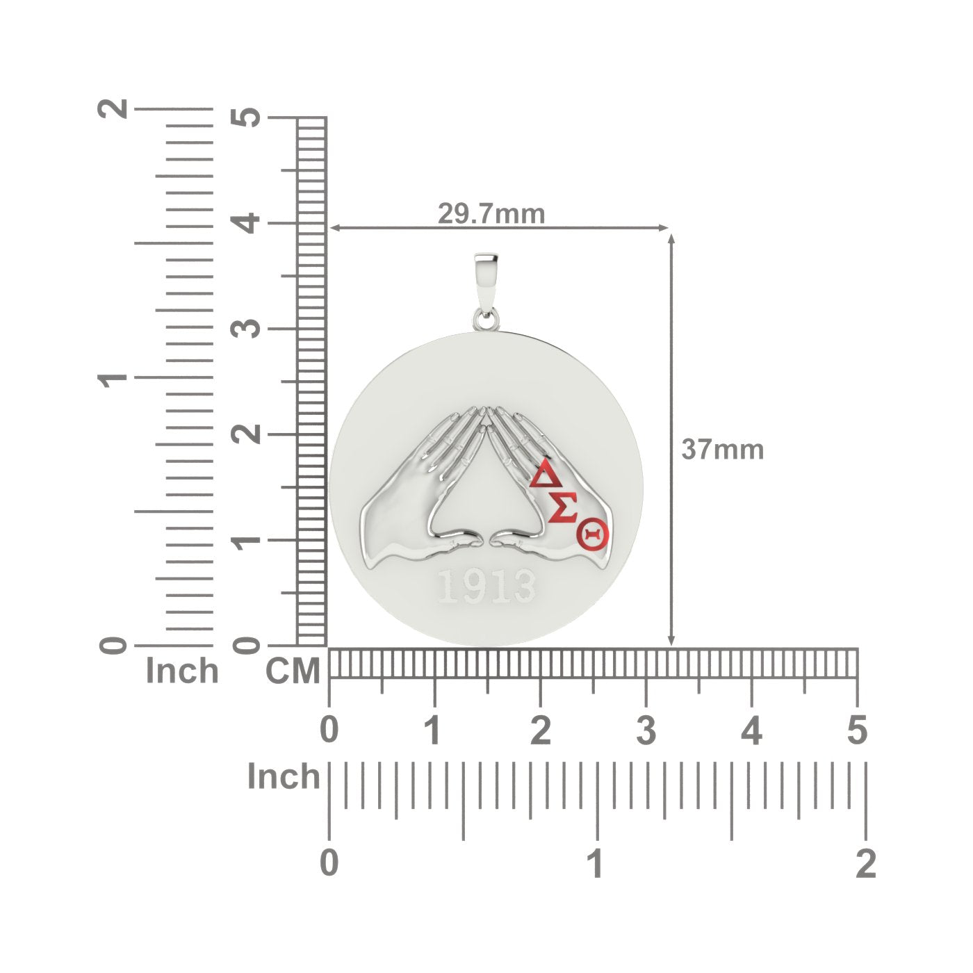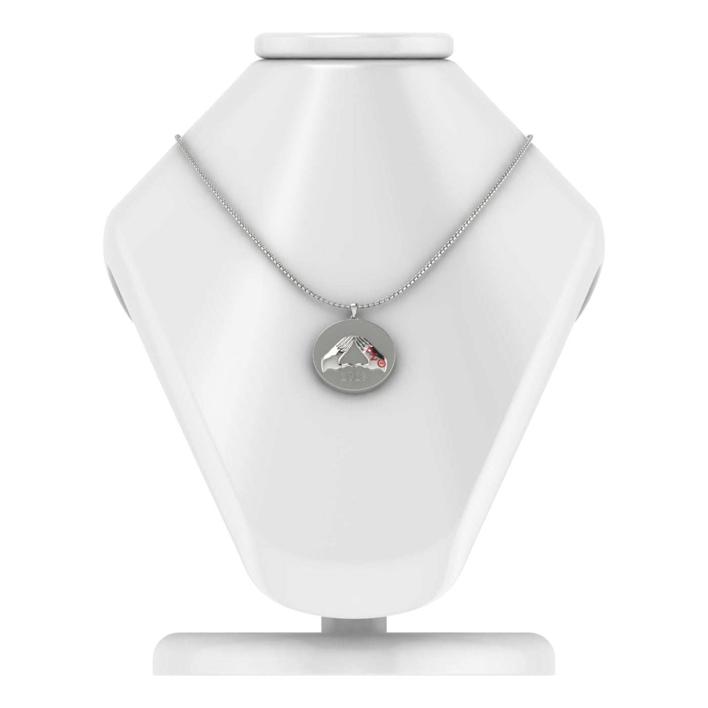 Celebrate the rich heritage of Delta Sigma Theta with this sterling silver circle pendant, featuring the iconic hand sign and the founding year, 1913. Detailed with red enamel letters, this quarter-sized piece offers a refined tribute to sisterhood and service. Please note, the silver chain is sold separately, allowing you to customize your look with elegance and pride.